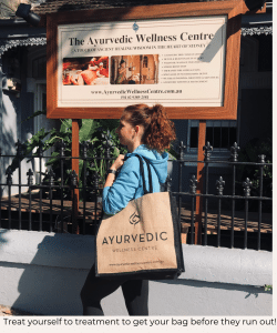 We’re so excited to show you our new centre that we’re offering a free gift with treatments or gift vouchers purchased during May. Simply buy a gift voucher on our website or drop into the Ayurvedic Wellness Centre for treatment, and you’ll receive one of our new environmentally-friendly tote bags – valued at $30 – on your way out.