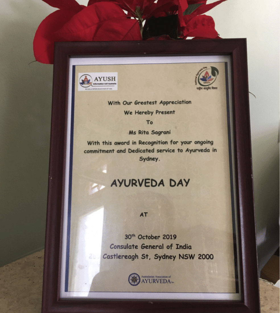 In 2019, Rita’s passion and deep expertise in Ayurvedic healing was recognised by the Ayurvedic Association of Australia. This award confirmed what 17,972 of our customers had already experienced: the authenticity and dedication with which Rita and the team bring India’s traditional healing practices to the Centre in Australia