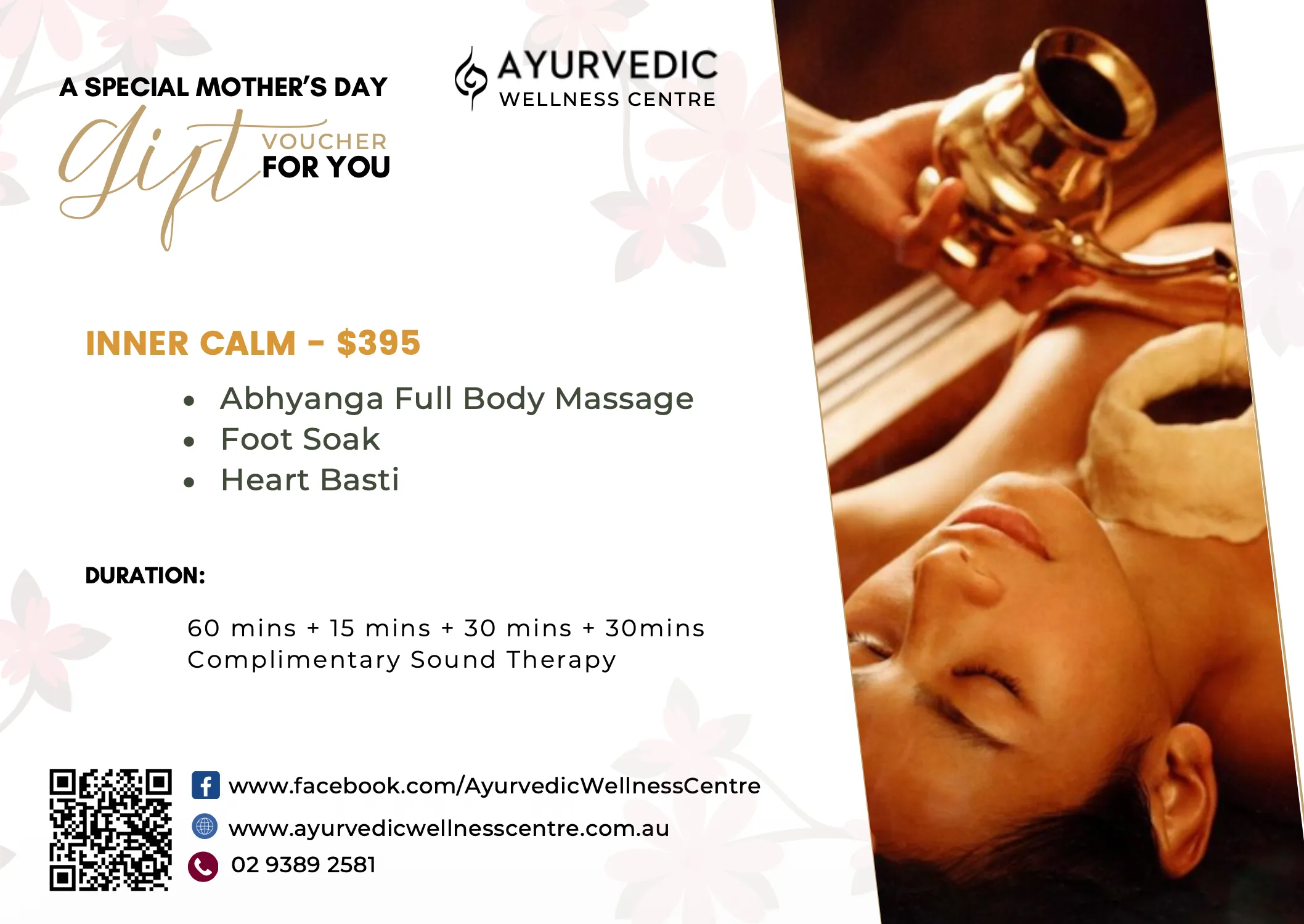 - Abhyanga Full Body Massage – 60 min – A calming and restorative massage that supports detoxification and deeply relaxes the body.